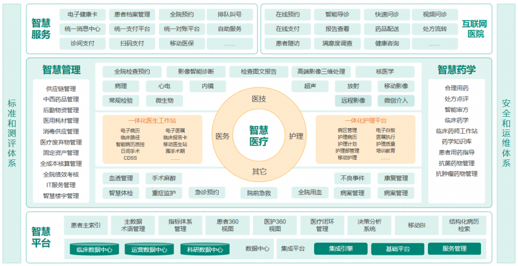 按照建设智慧医疗、智慧服务、智慧管理“三位一体”的智慧医院顶层设计,符合智慧医院各项测评要求。能够支撑线上线下一体化医疗服务新模式,通过智慧化、个性化提高医疗服务效率和质量,通过落实国家和行业信息化标准提升医院管理和信息化水平。
