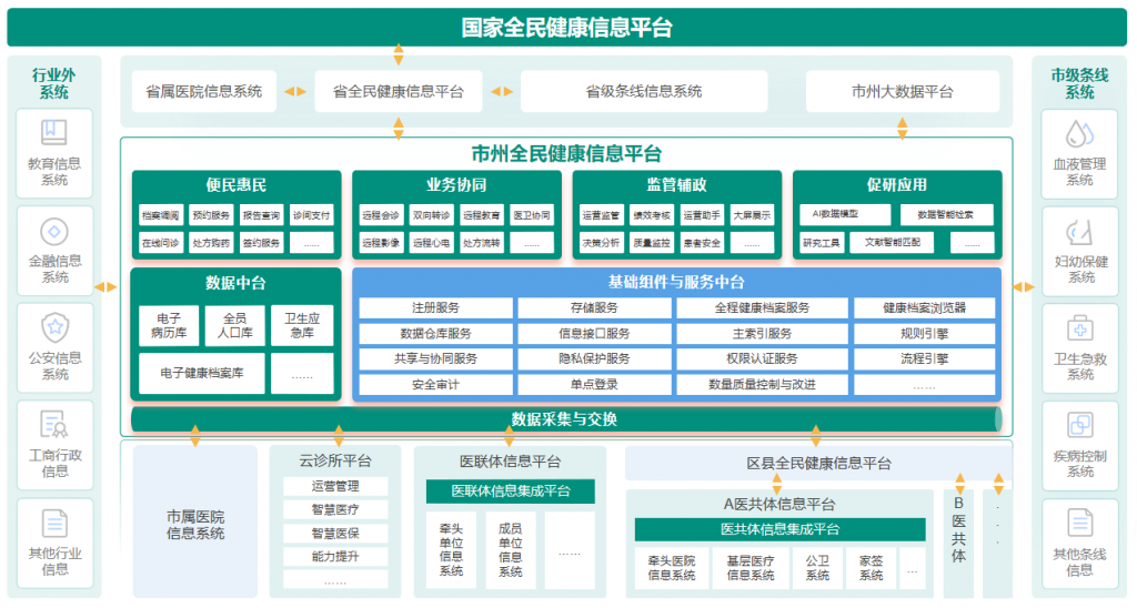 以医共体建设为核心支撑,全面助力打造高效、互联的全市全民健康信息平台。通过整合区域医疗资源,围绕便民惠民、业务协同、监管辅政、促研应用四大体系,打通市县乡村四级医疗机构的数据壁垒,构建一体化的健康服务体系,实现诊疗信息互通、资源共享和业务协同,让数据多跑路、群众少跑腿。