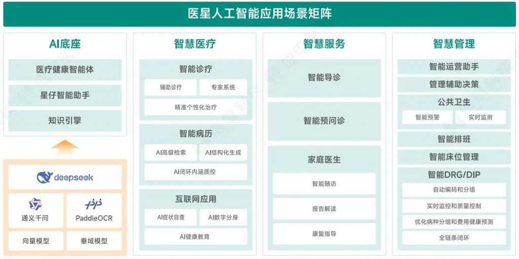 以 AI 中台为智能决策中枢,以大模型为创新引擎,深度融合 DeepSeek、通义千问等领先的生成式推理技术,打造集算法赋能、大数据治理、知识图谱构建、智能体协同于一体的全景医疗智能解决方案。构建医疗智能化创新基座,通过数据价值挖掘赋能 AI 应用落地,打通医疗信息系统壁垒,实现全场景数据融合互通,全面提升医疗机构数字化运营效能与智慧管理水平。